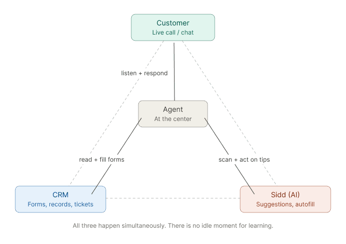 What I'm more confident in is the underlying principle. Onboarding that lives outside the work — in a training module, in a separate learning mode — won't be used in a high-pressure environment. Not because agents don't want to learn, but because there's no moment available for it.