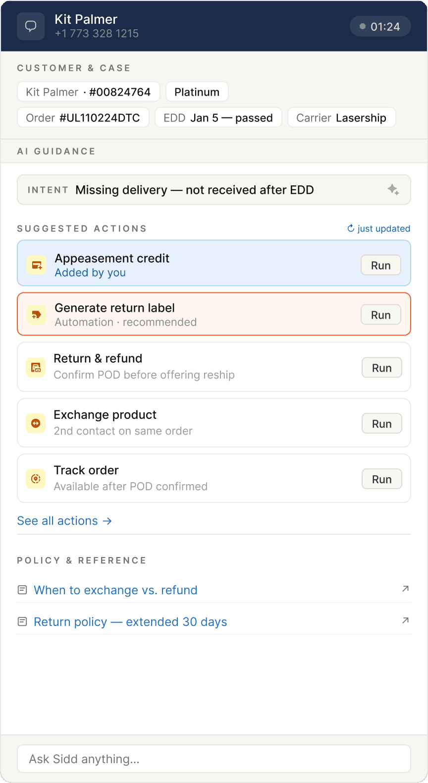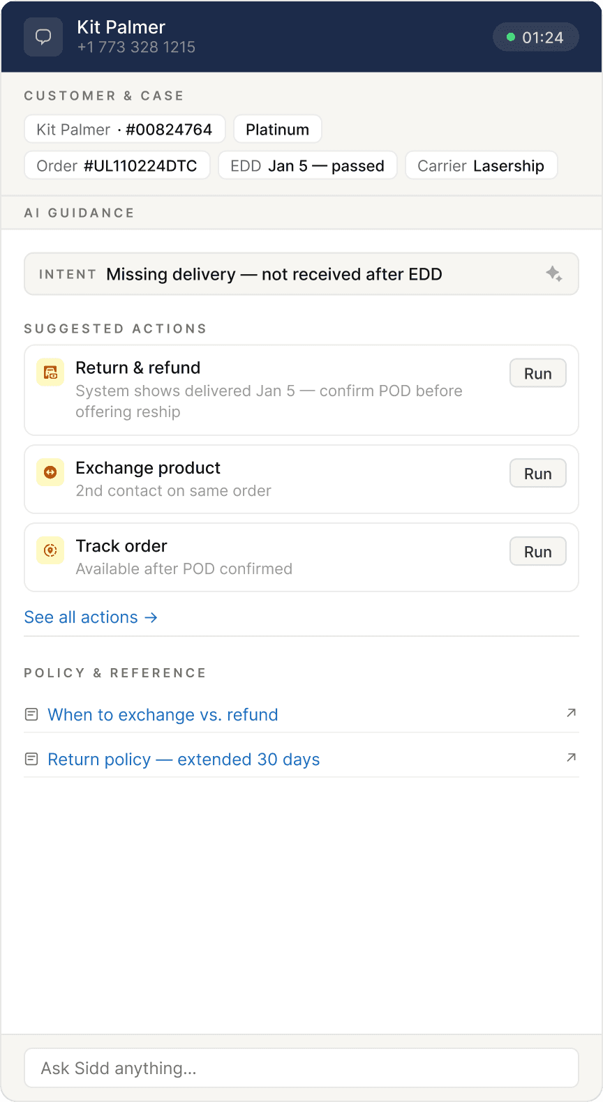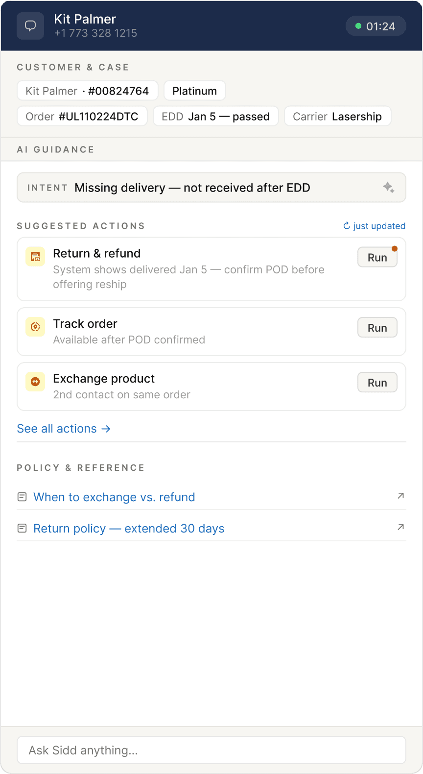 Before the agent needs to act, Sidd surfaces customer facts and three suggested actions. No prompt required. The frame is already built.