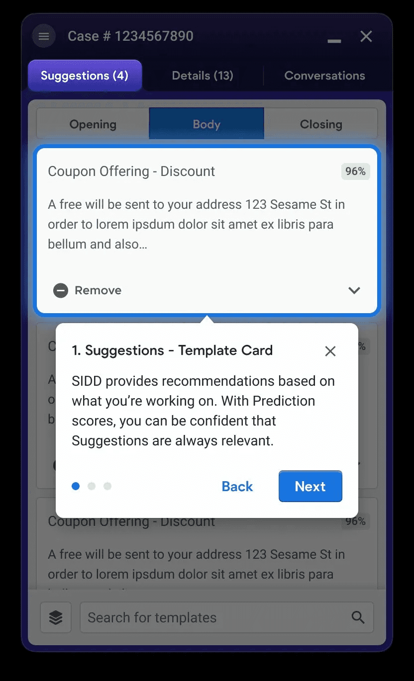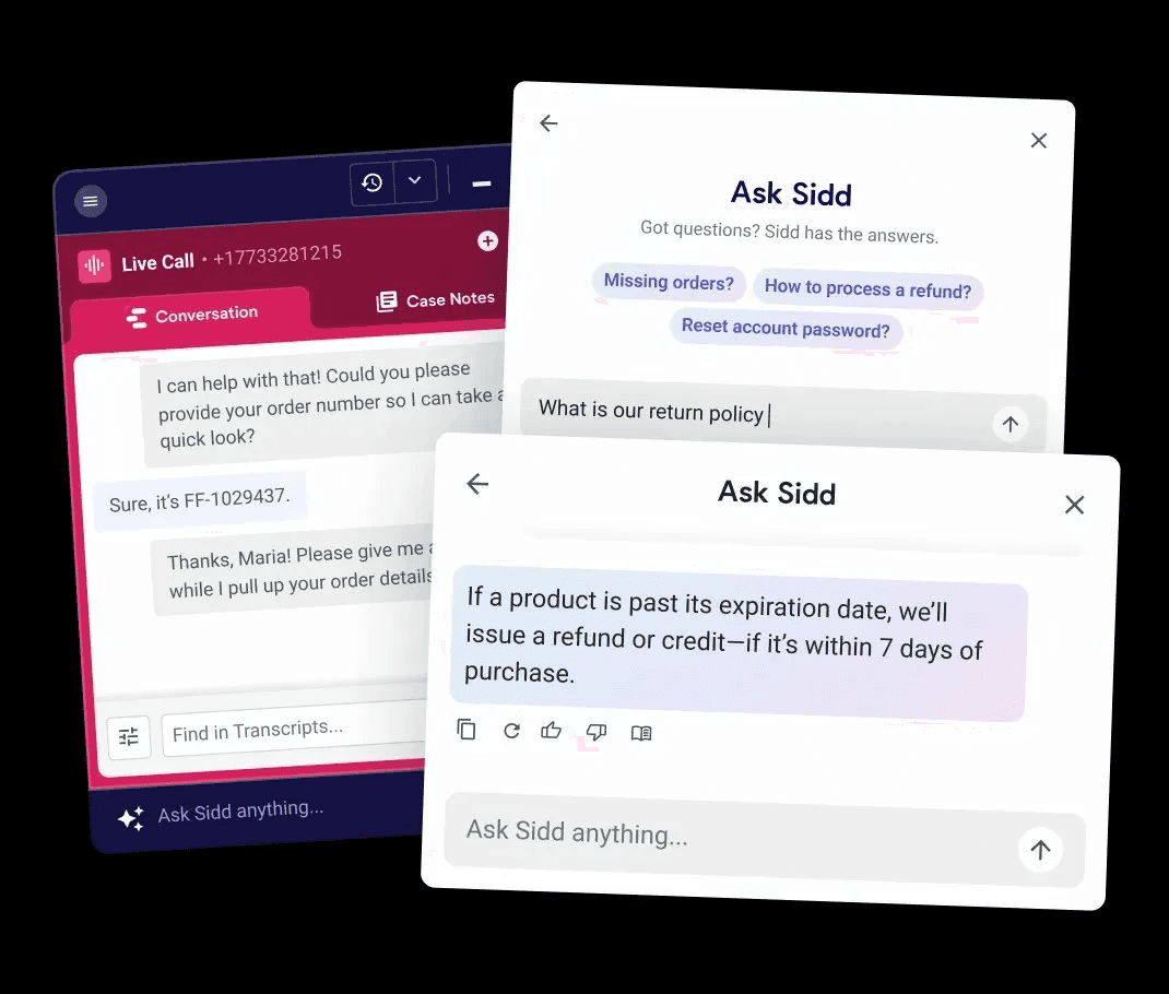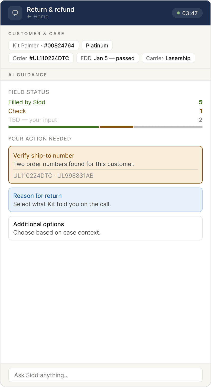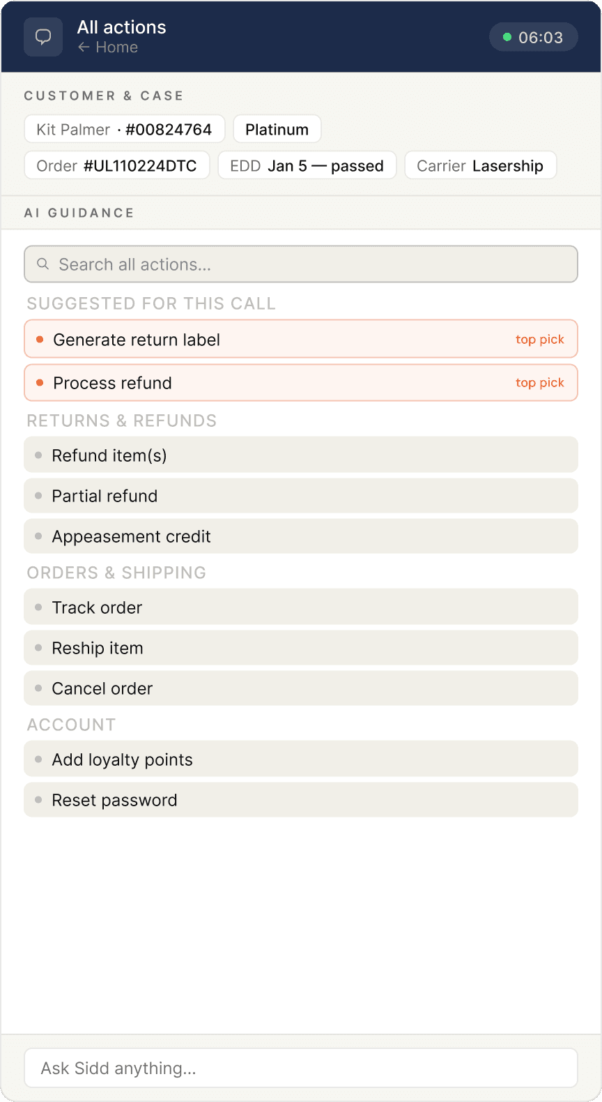 Before the agent needs to act, Sidd surfaces customer facts and three suggested actions. No prompt required. The frame is already built.