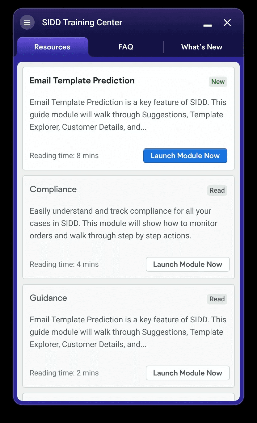 A dedicated module — Resources, FAQ, What's New — accessible from the system tray. Agents could launch guided walkthroughs of each Sidd feature before using it on a real call.