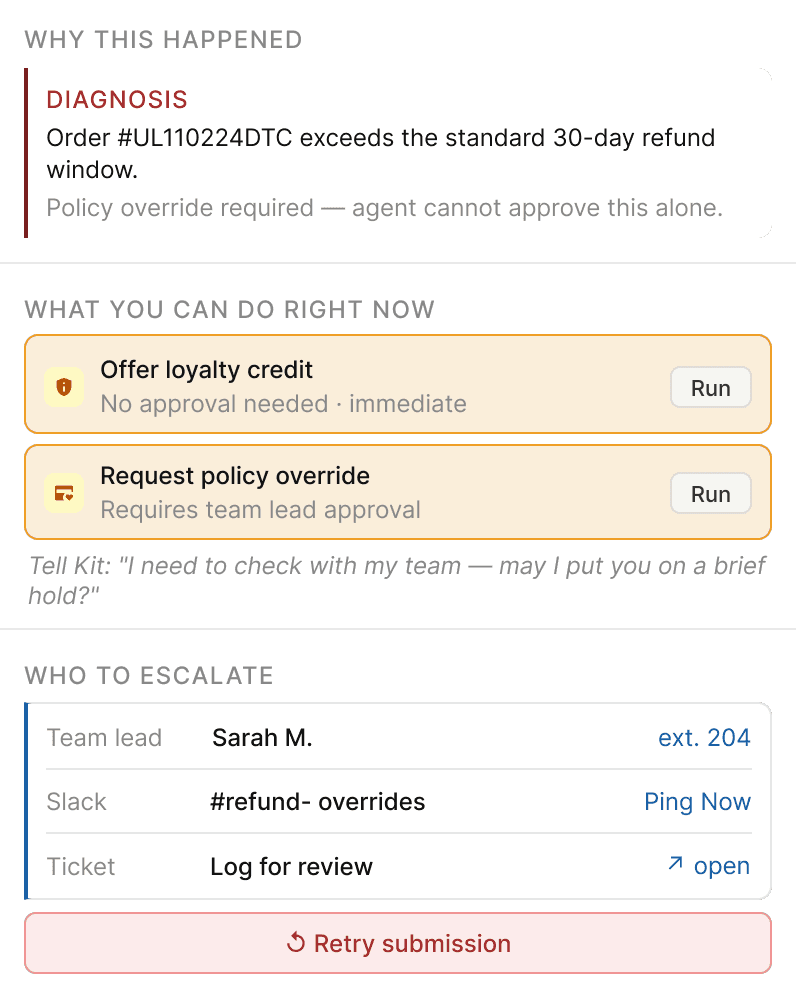The alternative is proactive disclosure. The system doesn't wait to be asked. It structures the relevant information upfront — based on what it already knows about the customer, the order, and the call — and presents it in a form the agent can scan and act on immediately.