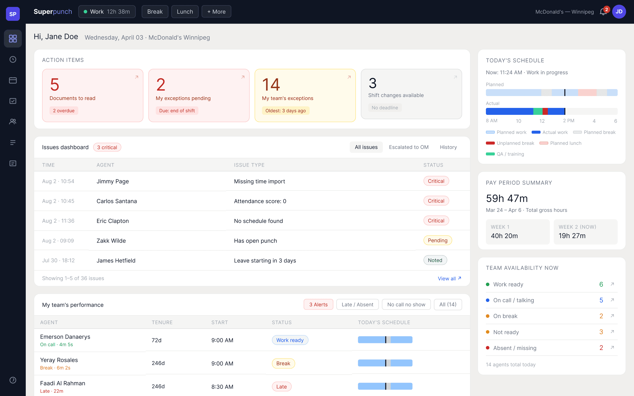 dashboard, and team performance anchor the left. Schedule timeline, pay period, and team availability move to the right as secondary reference. The most critical information is always at the top left — where supervisors look first.
