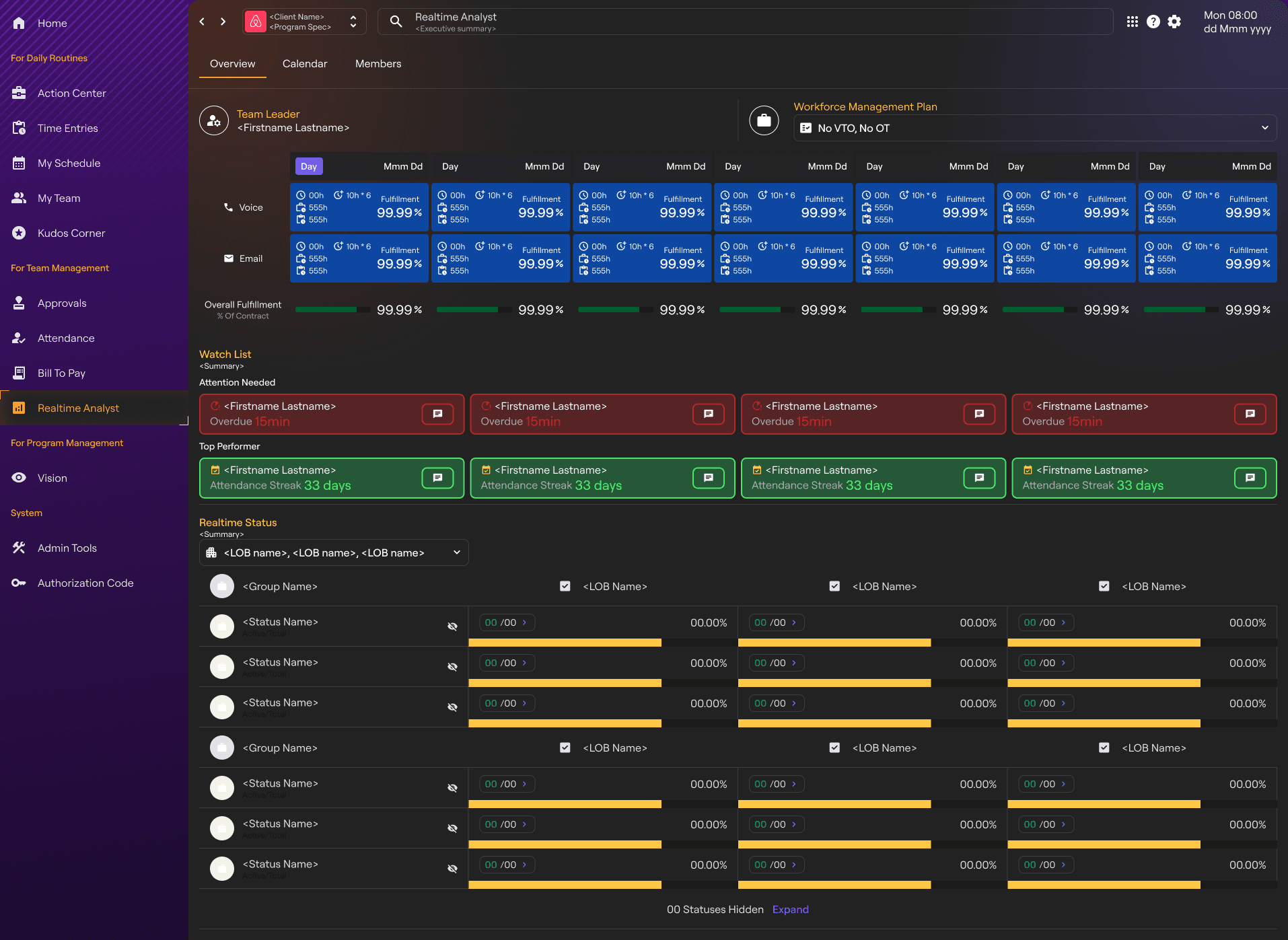 leadership: monitor employee activity, evaluate program capacity compared to the requirement and adjust workforce management accordingly