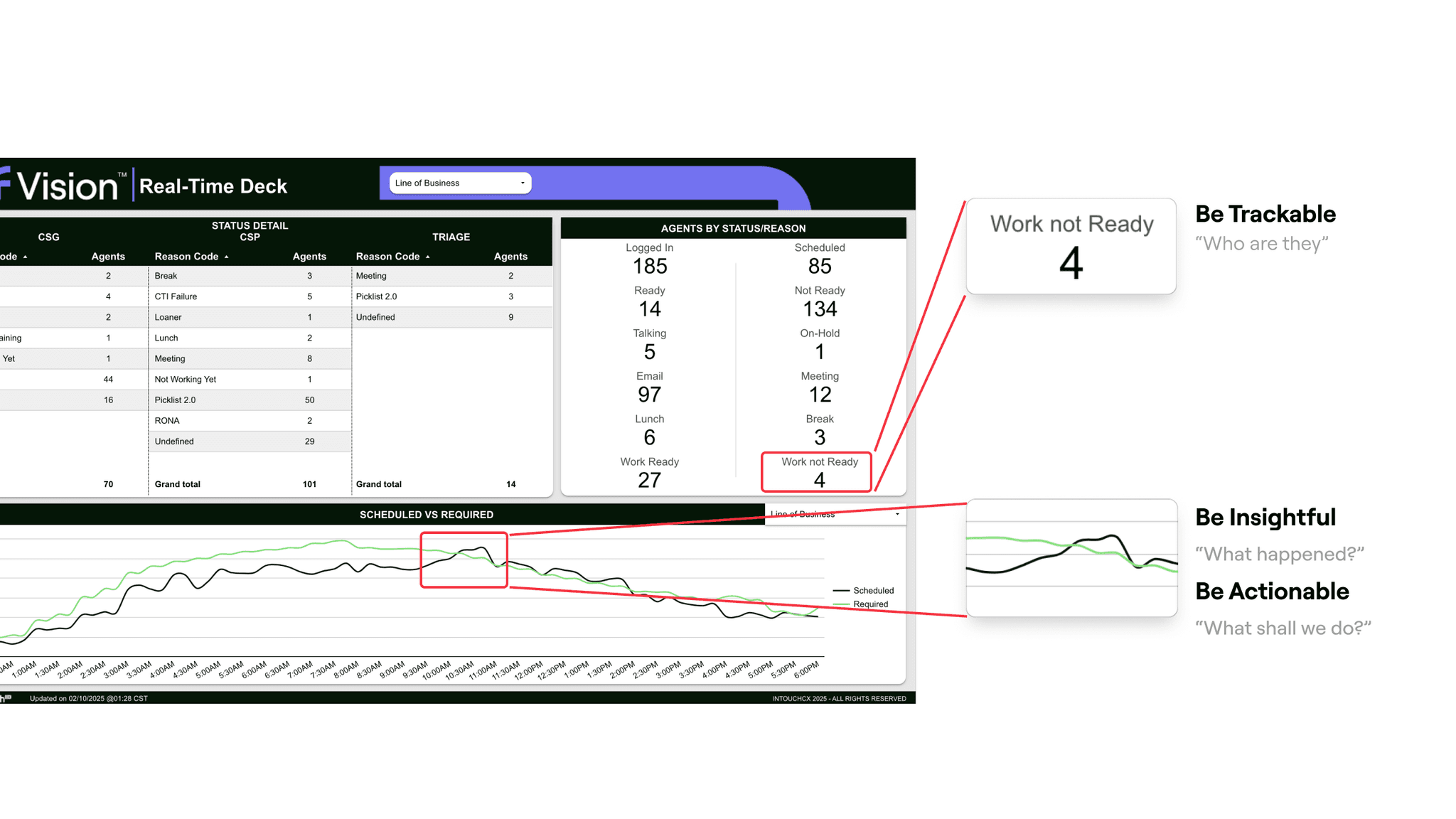 review schedule requirements and compare that to agents shift adherence (monitoring agents absences and tardiness) and compare that to current and project volume